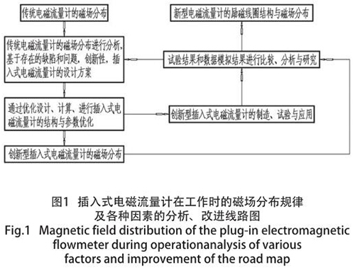 測水流量計因其特殊的結構形式,致使其抗干擾能力較弱、準確度偏低以及瞬時流量波動過大等不良現象,但便于安裝、造價低廉、普遍應用于大管道等特點而存在。為了發(fā)揮其優(yōu)勢,消除其不利因素,對其內部結構及其相關技術參數進行優(yōu)化設計,從而使其準確度能夠達到 ±1% FS,使抗干擾能力得到極大地增強。本文主要通過優(yōu)化設計、選擇材料和試驗,使測水流量計的穩(wěn)定性和準確度大幅度提高,并提出解決措施,對實際應用具有參考價值。分析與研究程序圖如圖 1 所示。