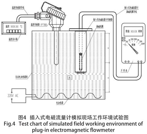 其原因是:勵磁線圈的阻值及匝數是按照常溫狀態(tài)下進行設計的,而含有勵磁線圈的測水流量計經常是高于常溫狀態(tài)下進行安裝、使用(如:高爐回水、供熱管道等),勵磁線圈的阻值隨使用環(huán)境溫度的變化而變化,致使測水流量計測量時的準確度大為降低,性能的不確定性大為增加,為了保證儀表的高準確度和穩(wěn)定性,在不同的季節(jié)(主要是環(huán)境溫度和介質溫度),經過大量模擬現場實際情況的試驗,并結合轉換器的技術參數要求,得出一個完善的勵磁線圈各種技術參數。模擬現場試驗裝置如圖 4 所示。