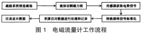 智能渦輪流量計的產(chǎn)生主要是基于法拉*電磁感應(yīng)定律。在智能渦輪流量計的應(yīng)用中,磁路系統(tǒng)會在流量計運行過程中逐步出現(xiàn)直流磁場與交流磁場,該磁場的產(chǎn)生為后期的測量提供了良好的前提條件,營造了測量所需的磁場環(huán)境,因此,在智能渦輪流量計應(yīng)用時,一旦被測液體在導(dǎo)管中經(jīng)過該磁場環(huán)境時,必然會產(chǎn)生一定的切割磁力線運動,在這種情況下,電極傳感器就會發(fā)揮其作用,將導(dǎo)管內(nèi)的流量轉(zhuǎn)換為感應(yīng)電勢信號,隨后此轉(zhuǎn)換形成的信號逐步被傳遞給轉(zhuǎn)換器。而轉(zhuǎn)換器更是可以將所獲得的流量信號等加以處理,通過分析、對比等,轉(zhuǎn)換器會將該信號變?yōu)闃?biāo)準(zhǔn)信號,隨后將該信號輸出給積算儀,進一步進行信號的處理,這些處理以后的信號*終會在智能渦輪流量計的儀表中顯示,呈現(xiàn)*終的流量測量結(jié)果,其基本的流程如圖 1 所示。