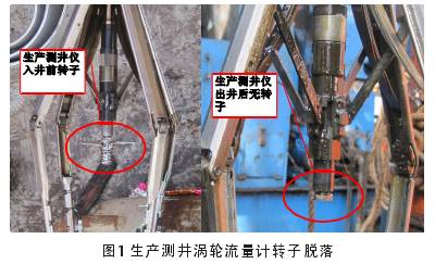 測井儀底部氣體渦輪流量計在四上四下測井任務(wù)中轉(zhuǎn)速過快,地面直讀顯示該轉(zhuǎn)子的*高轉(zhuǎn)速達(dá)到260rps,超過了轉(zhuǎn)子的安全工作轉(zhuǎn)速.上限200rps,同時需長時間滯留在產(chǎn)層位置進(jìn)行流壓測試操作,因此直接原因為轉(zhuǎn)子在高溫高流速的極限工作環(huán)境下發(fā)生脫落,影響了測井?dāng)?shù)據(jù)的錄取,如圖1所示。