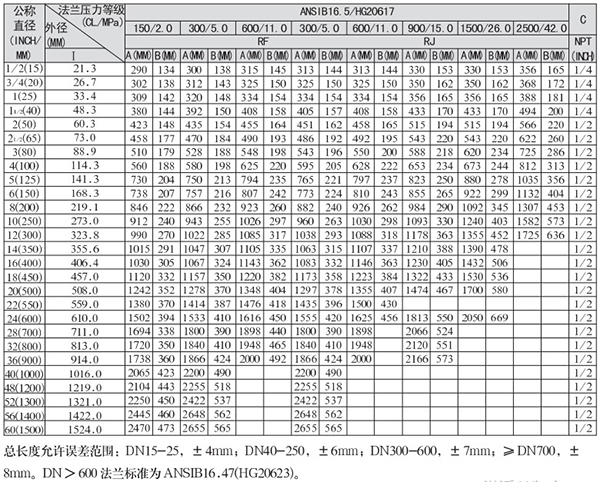 壓力等級(jí)(CL/MPa):150/2.0、300/5.0、600/11.0、900/15.0、1500/26.0、2500/42.0
