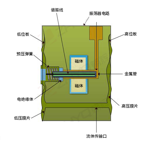 由磁場(chǎng)驅(qū)動(dòng)的振蕩器電路會(huì)導(dǎo)致導(dǎo)線以其共振頻率振蕩。導(dǎo)線的一側(cè)牢固地固定到靜態(tài)部件,而另一側(cè)則連接到膜片。彈簧使電線預(yù)緊。由于過(guò)程壓力對(duì)隔膜的影響,金屬絲將在壓力升高時(shí)拉伸,而在壓力降低時(shí)收縮。共振頻率將相應(yīng)地增加或減少。數(shù)字計(jì)數(shù)器測(cè)量諧振頻率的變化,并將其信號(hào)傳遞給微芯片,該微芯片還處理線性化補(bǔ)償和溫度補(bǔ)償。