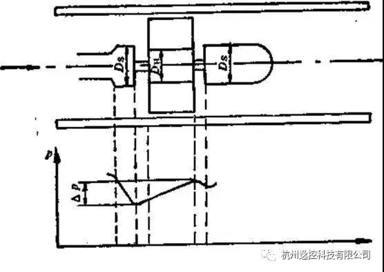由于流體通過(guò)渦輪時(shí)會(huì)對(duì)渦輪產(chǎn)生一個(gè)軸向推力,使鈾承的摩擦轉(zhuǎn)矩增大,加速鈾承磨損,為了消除軸向力,需在結(jié)構(gòu)上采取水力平衡措施,這方法的原理見(jiàn)下圖所示。由于渦輪處直徑DH略小于前后支架處直徑Ds,所以,在渦輪段流通截而擴(kuò)大,流速降低,使流體靜壓上升P,這個(gè)P的靜壓將起到抵消部分軸向推力的作用。