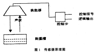 常見(jiàn)的液位傳感器有磁浮筒式、壓力式等,磁浮筒式傳感器要安裝在被測(cè)介質(zhì)中,長(zhǎng)時(shí)間使用易被腐蝕,而壓力傳感器輸出線(xiàn)性較差且成本較高。超聲波傳感器的特點(diǎn)是使用時(shí)與液面脫離接觸,無(wú)腐蝕問(wèn)題,且價(jià)格低廉。超聲波傳感器由控制卡及換能器構(gòu)成,如圖I。