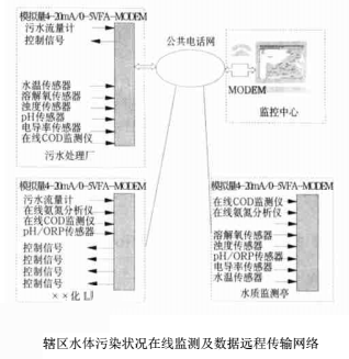 本文介紹的水體污染狀況在線監(jiān)測及數(shù)據(jù)遠(yuǎn)程傳輸網(wǎng)絡(luò)可以連續(xù)、自動監(jiān)測排污口的污水流量和水質(zhì)參數(shù),既可以分別顯示污水流量的瞬時值/日平均值/月平均值、pH/溶解氧/電導(dǎo)率/濁度/水溫/COD/TOC/NH4-N/**3-N等常規(guī)參數(shù),也可以實時計算污染物排放總量并經(jīng)公共通信網(wǎng)絡(luò)(電話線路)傳輸至區(qū)(縣)、市級的監(jiān)控中心,在轄區(qū)的電子地圖(GIS)上動態(tài)顯示各排污口的*新數(shù)據(jù),是環(huán)保、市政、水利等監(jiān)理部門實時觀測轄區(qū)水質(zhì)變化情況的現(xiàn)代化管理工具。系統(tǒng)組成如下: