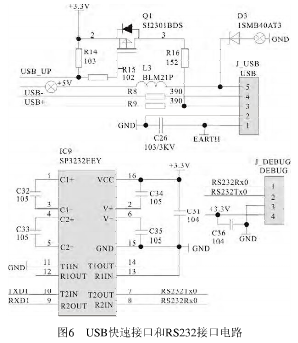 由Q1、R14、R15、R16、L3、D3、R8和R9等元件組成的電路與單片機(jī)對應(yīng)電路,組成等元件組成的電路與單片機(jī)對應(yīng)電路,組成USB快速接口電路。快速接口電路。IC9(SP3232EEY)芯片與周圍元)芯片與周圍元件組成RS232接口電路。電路如圖6所示。