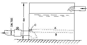 案例4 廣西某水廠在郊區(qū)山頭設(shè)置清水池,利用水池高度勢能發(fā)送成品水。運行人員反映計量出水量的DN700mm酸堿污水流量計有時候流量顯示不穩(wěn)?;蝿舆_百分之十幾到百分之二十,誤差也大,估計相差約20%?,F(xiàn)場考查發(fā)現(xiàn)水池如圖7-9所示安裝流量傳感器,水位高度不足就會卷入氣泡,甚至流量傳感器測量管內(nèi)不能充滿。如水位降至A線時,雖高出吸入口頂端,但高出不多,還會在C處產(chǎn)生旋渦,將水位表面空氣卷入形成氣泡,使顯示晃動;若水位降到B,測量管將不滿管。我們建議如圖虛線所示裝一彎頭,擴大水池有效容量,減少吸入氣泡的機會,彌補原設(shè)計的不足。這類實例是經(jīng)常遇到的。